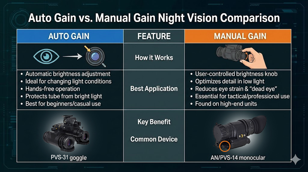 When diving into the world of high-end night vision, you will quickly encounter a technical debate that divides professionals and enthusiasts alike: Auto Gain vs. Manual Gain. Whether you are looking to purchase your first an pvs-14 or upgrading to a professional-grade pvs31a, understanding how these systems manage light amplification is crucial for your performance in the field.